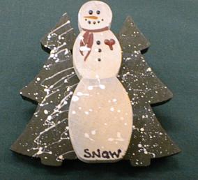 Primitive Snowman Pin The snowman is tall and thin with two snow covered pine trees beside him. He is great to wear thoughout the winter months. The pin measures 2 1/2" tall by 2" wide. Cost is $5.00 plus shipping.