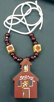 School House Necklace The schoolhouse necklace is barn red with Navy windows and a yellow bell. The necklace has a satin lace, red beads and two square yellow beads with ABC or 123. There is an apple painted on each square bead. The schoolhouse measures 2" tall by 2 1/2" wide. Cost is $5.00 plus shipping.