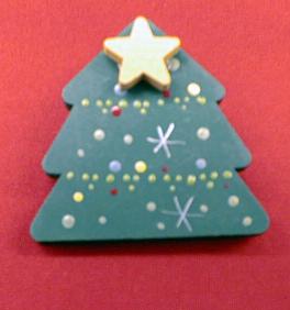 Christmas Tree Pin The bright green Christmas tree pin has holiday lights and a yellow star at the top. The pin measures 2 1/2" tall by 2 1/2" wide. Cost is $5.00 plus shipping.