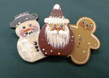 Snowman, Gingerbread, Snowman and Santa Pin This pin features a snowman, roly poly Santa and gingerbread man. A popular pin because it focuses on all our holiday favorites. The pin measures 3" tall by 2" wide. Cost is $7.00 plus shipping.