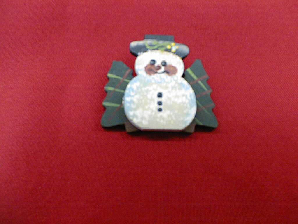 Traditional Snowman Pin The snowman is more traditional and wears a hat. He also has two trees with a plaid design. He is great to wear thoughout the winter months. The pin measures 2" tall by 2" wide. Cost is $5.00 plus shipping.